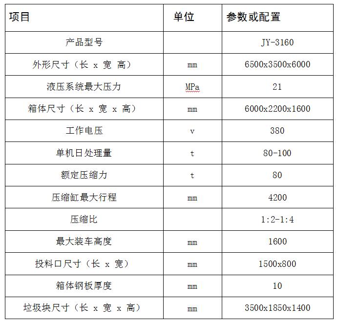 JY-3160 水平式四柱舉升垃圾壓縮設備主要用于對城鎮內小區、居民點、學校、醫院、公園景區、廠礦和機關院校的生活垃圾以及固體廢棄物的收集、壓縮減容和封閉轉運。